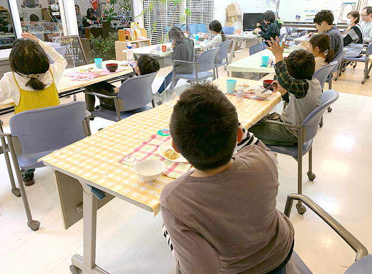 夕方6時頃から夕食の時間です。今日の当番を各自で確認し、それぞれ夕食の準備が始まります。自分の役割を行う、配膳する、取り分けや席決めなど子どもたちが協力して食事の準備を行います。「メニューは何かな?」と食事を楽しみにする姿、苦手な食べ物にチャレンジする姿など食を通じ笑顔になれる時間や居場所になっています。